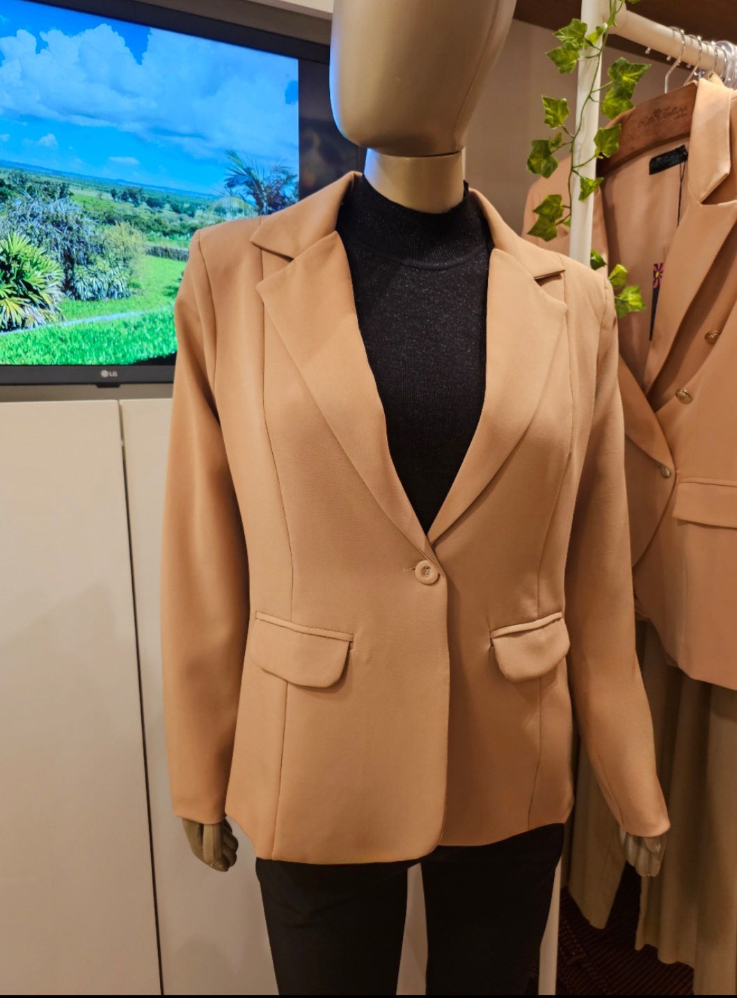 Blazer cor nude elegante, confeccionado em tecido alfaiataria com 5% elastano para dar conforto aos movimentos.