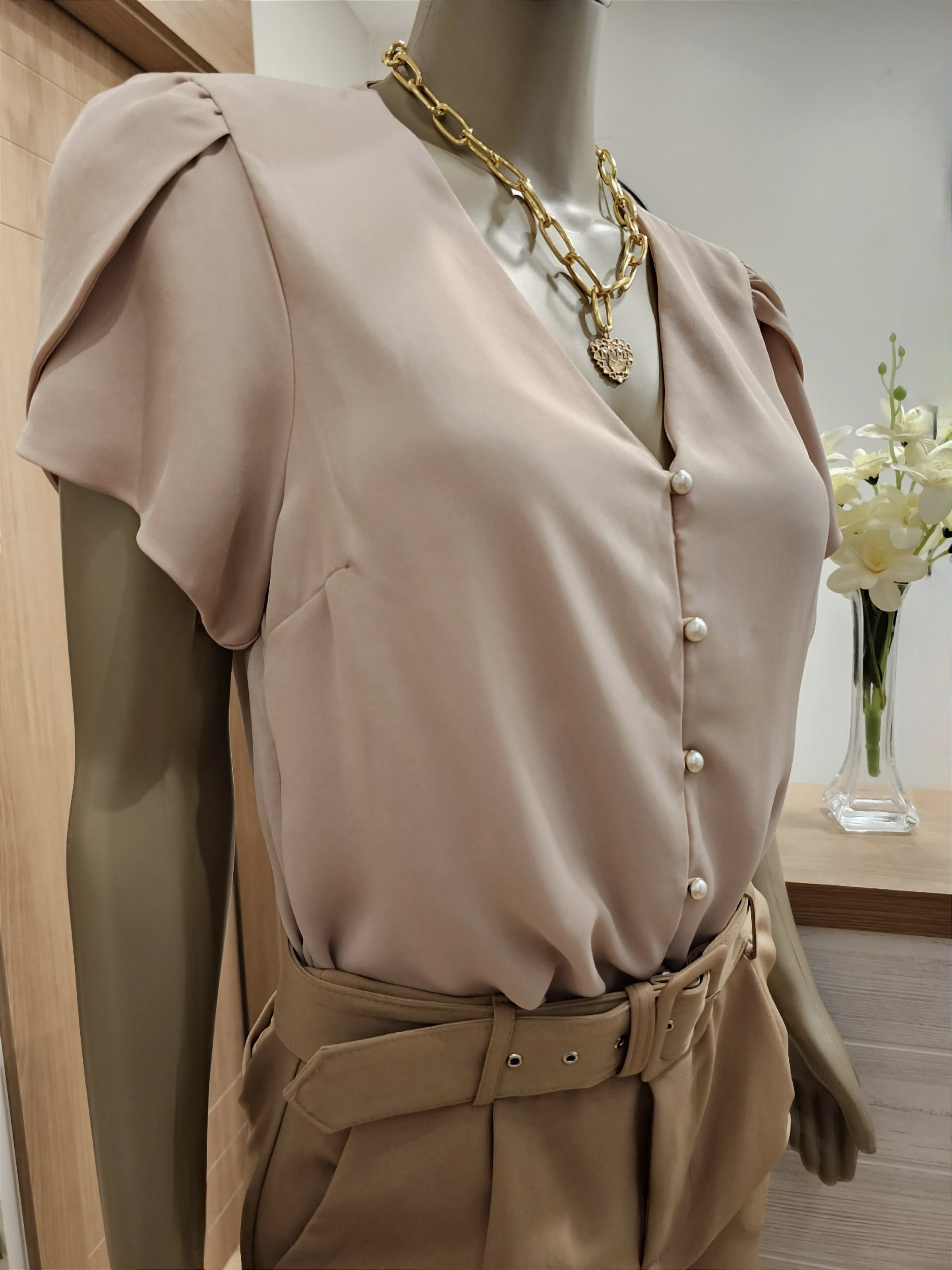 Detalhe fechamento em botão perolado, manga tulipa formato flor que dá um toque de elegância e sofisticação.