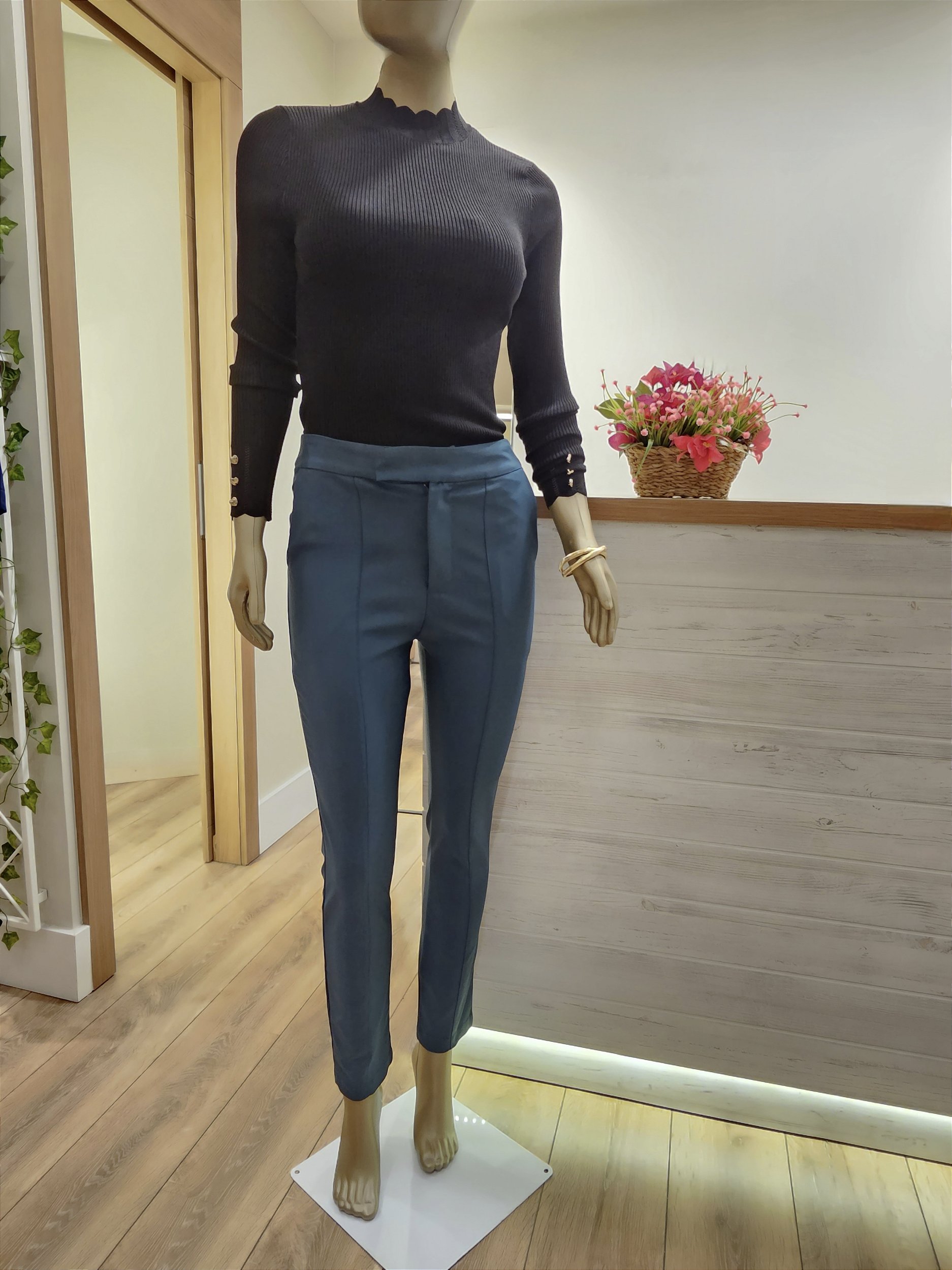 Detalhe da costura em nervura vertical no meio da perna, que alonga a silhueta e dá um toque de sofisticação.