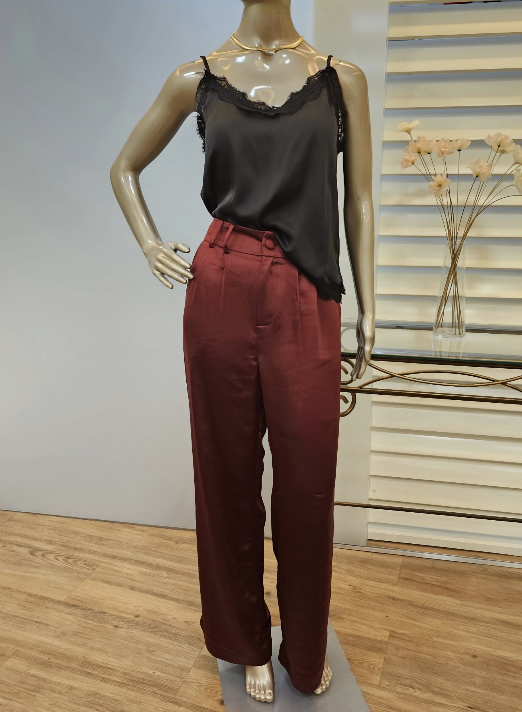 Calça em tecido crepe, de acetinado suave, que une o conforto e a elegância da alfaiataria feminina.