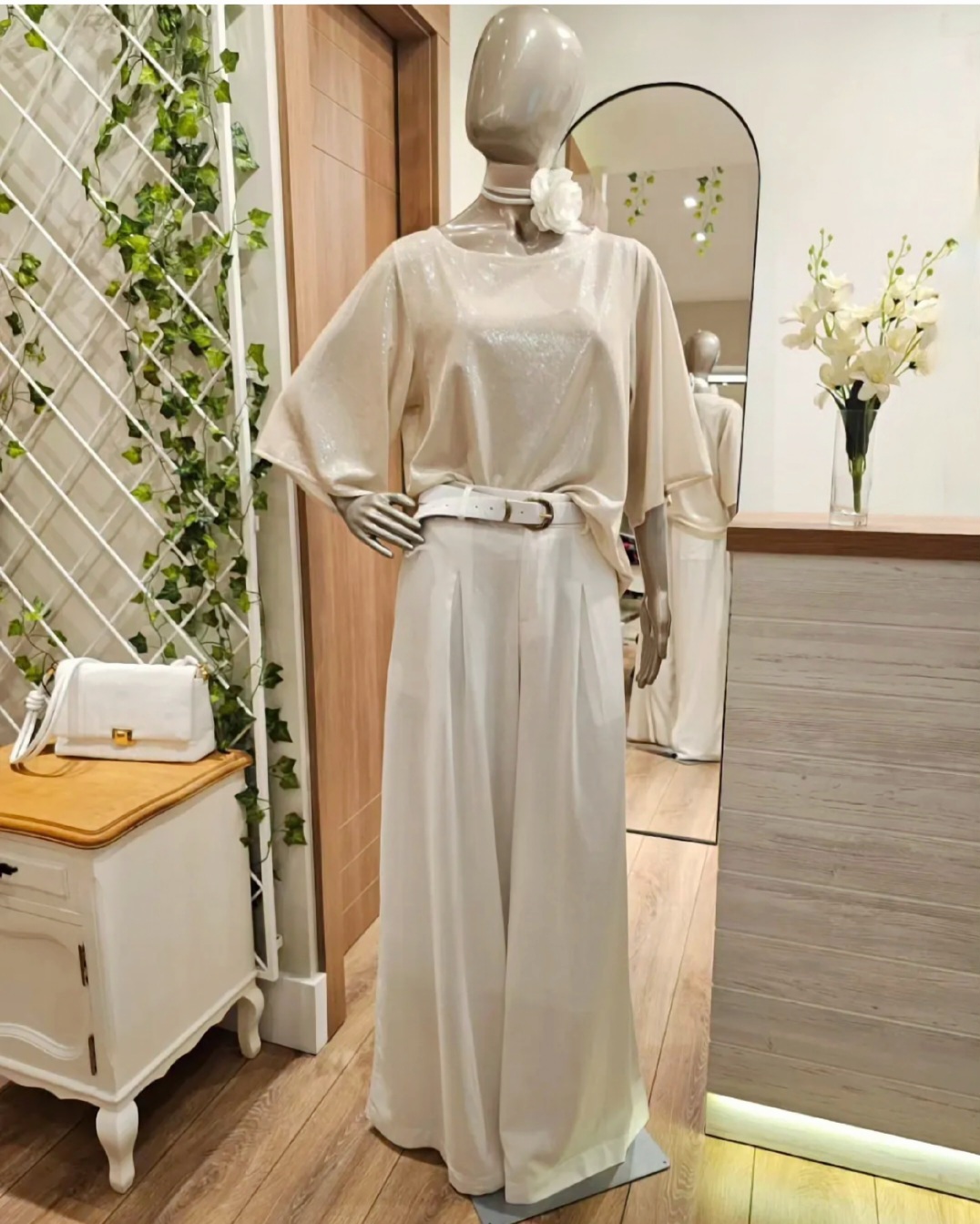 Calça pantalona, modelagem bem ampla, tecido fluido viscose, corte reto, cintura alta com passantes para o cinto do mesmo tecido, fechamento frente com zĂper, prega frontal, bolso faca na lateral e costa bolso quadrado.