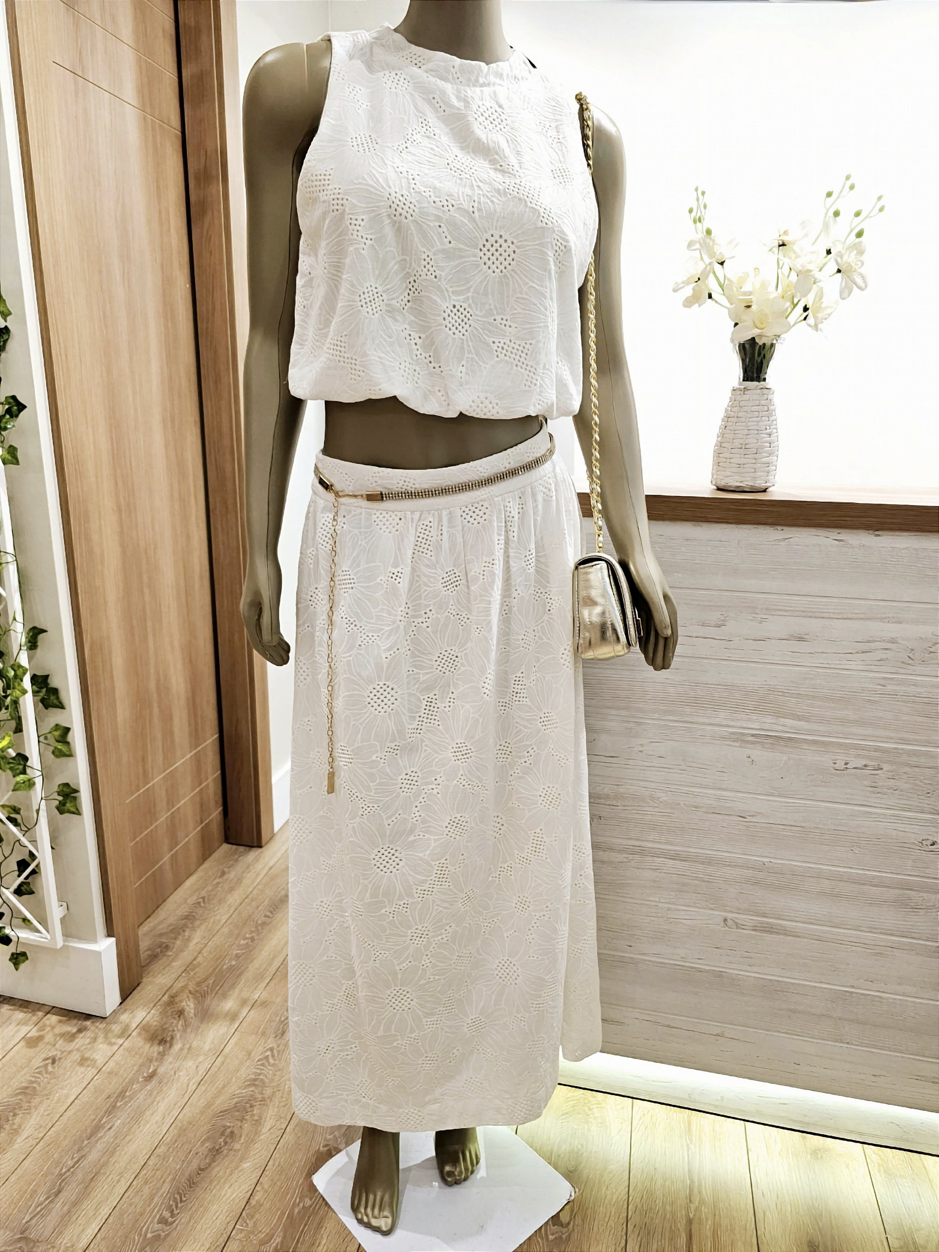 Conjunto saia e cropped. A confecção foi feita em tecido algodĂŁo laise, todo trabalhado com bordado em relevo vazado delicado na cor off-white, que combina com leveza, romantismo e elegância.Â