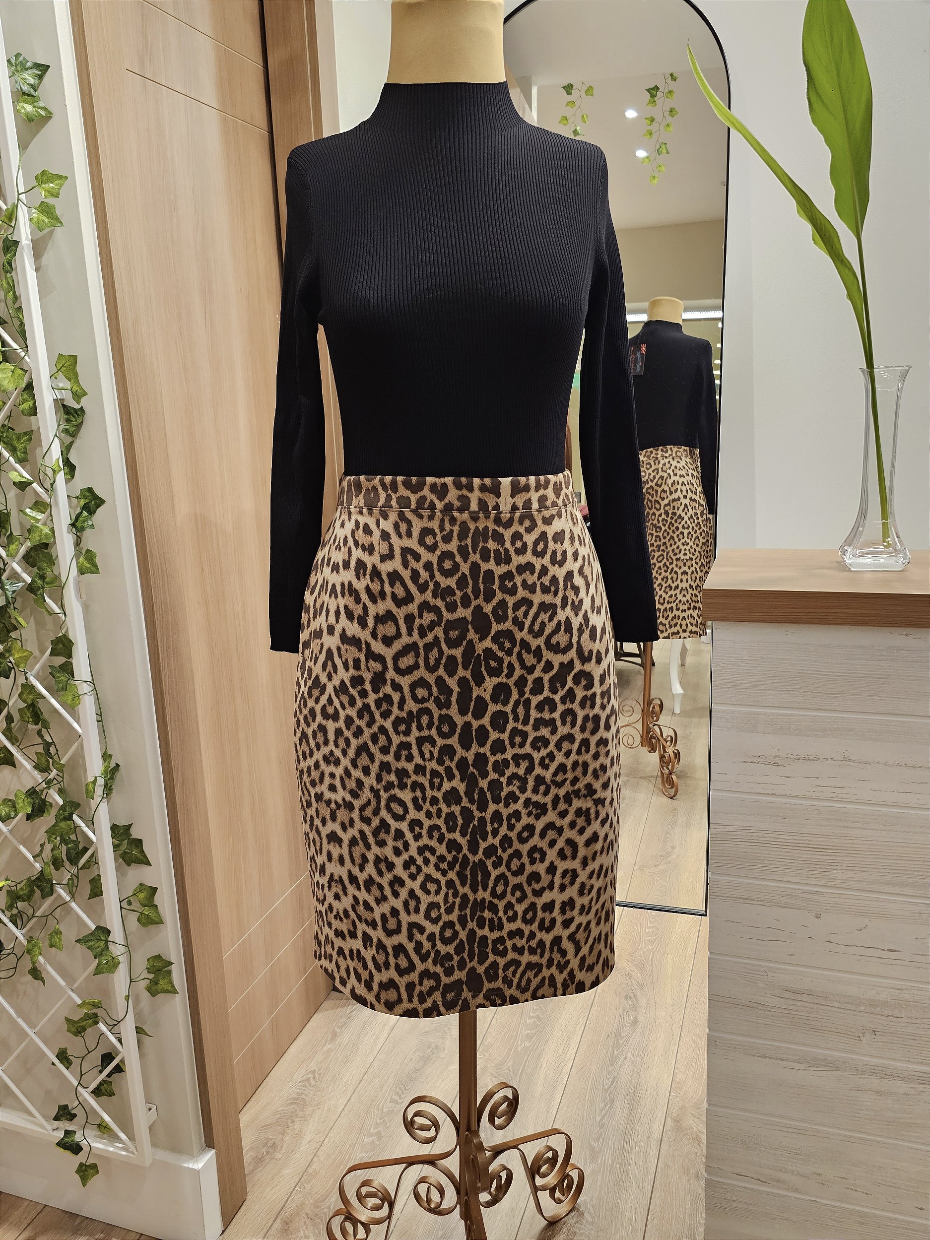 Saia curta, modelagem lápis, sendo mais ajustada ao corpo.