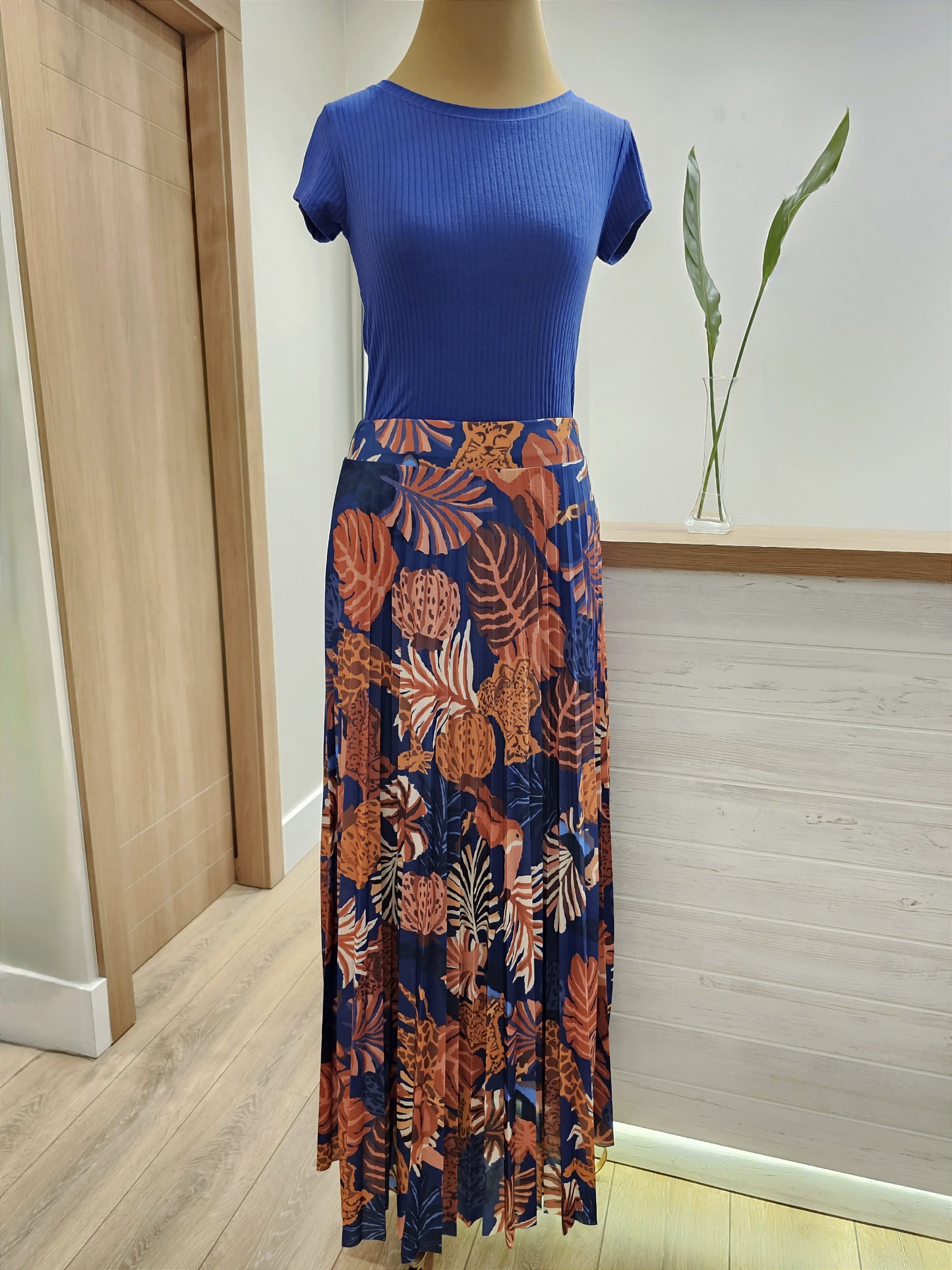 A cor azul predominante na estampa da saia cria contraste com a cor caramelo, cores que se completam.