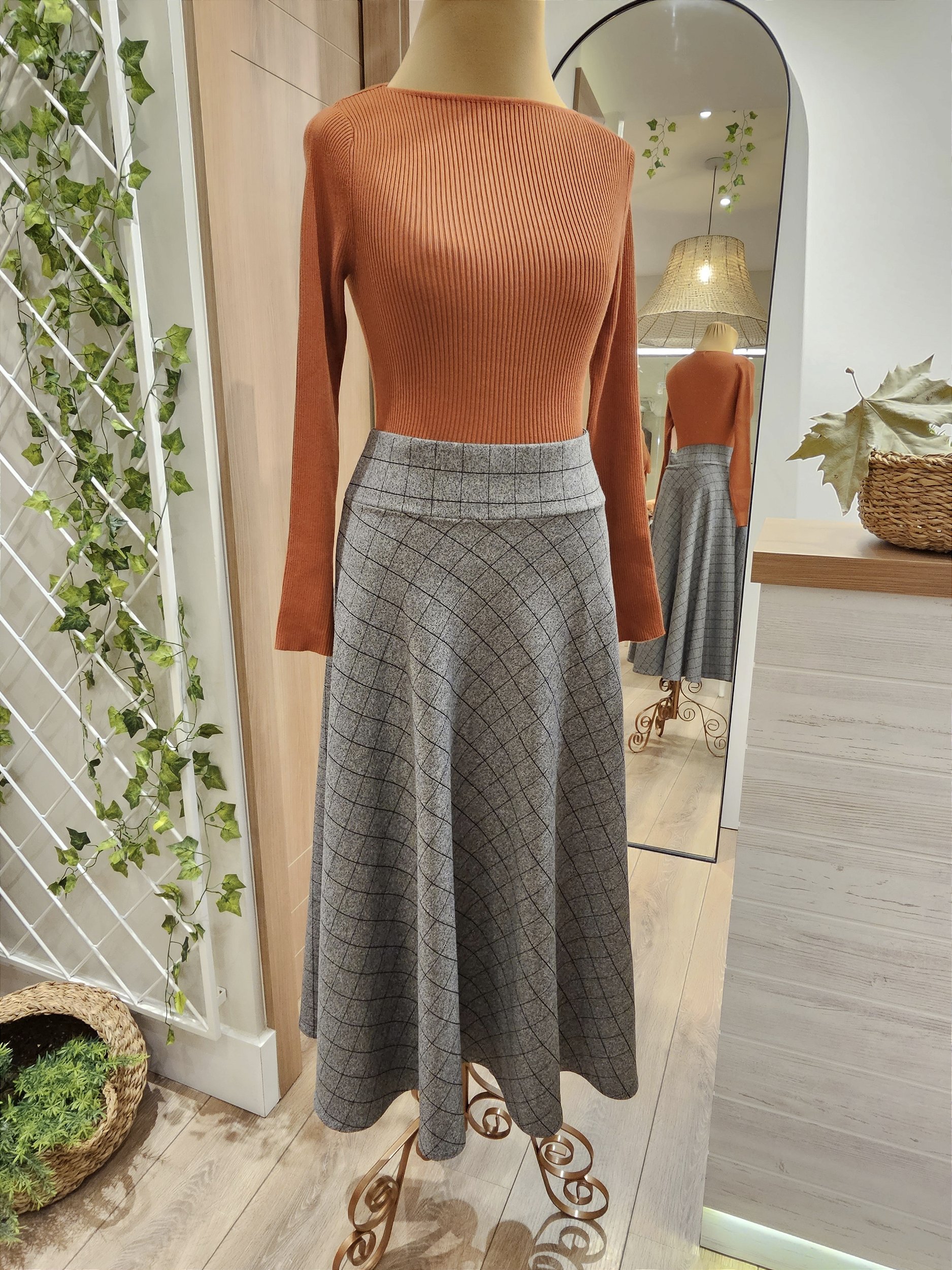 Saia midi confeccionada em tecido malha flanelada, sendo o lado interno fofo e quentinho para o frio.