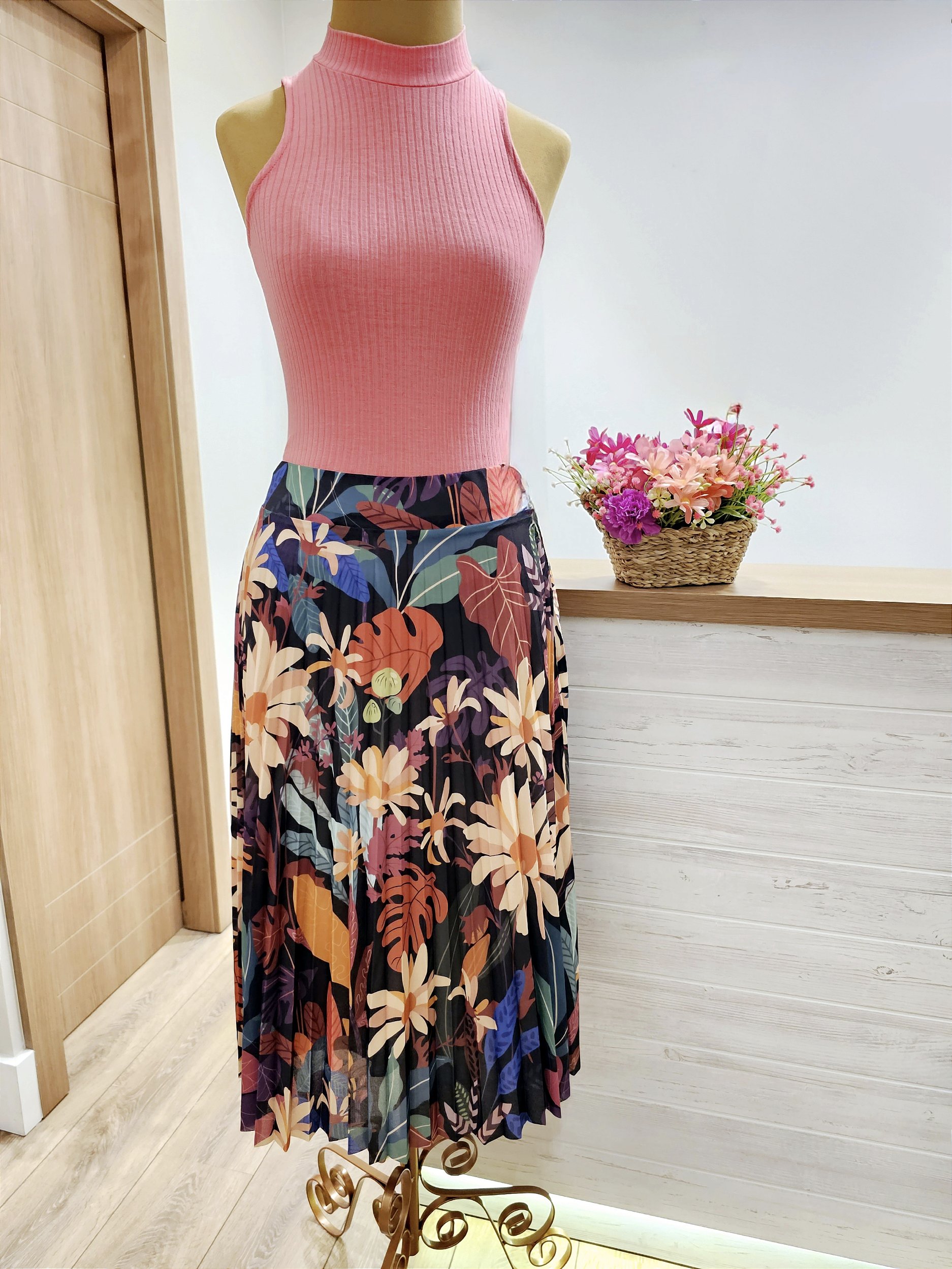 É versátil, você pode fazer várias combinações de blusas com cores da padronagem da saia. Vai ficar ótimo!