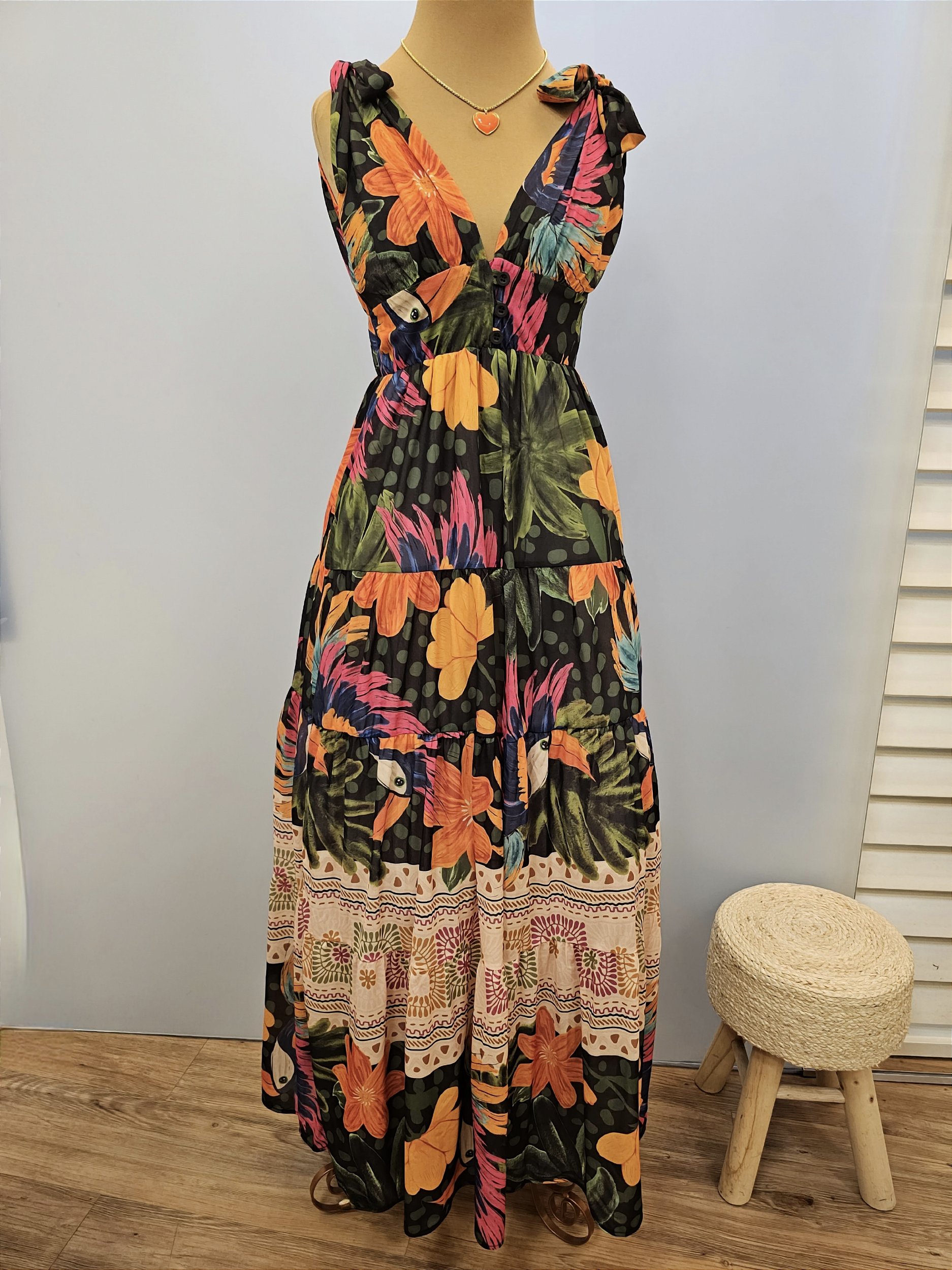 Vestido longo Isabelle, tem estampa inspirada na fauna e flora brasileira, com pássaro tucano e flores alegres, alças em amarração que pode ser laços, dando um toque romântico e delicado a peça.