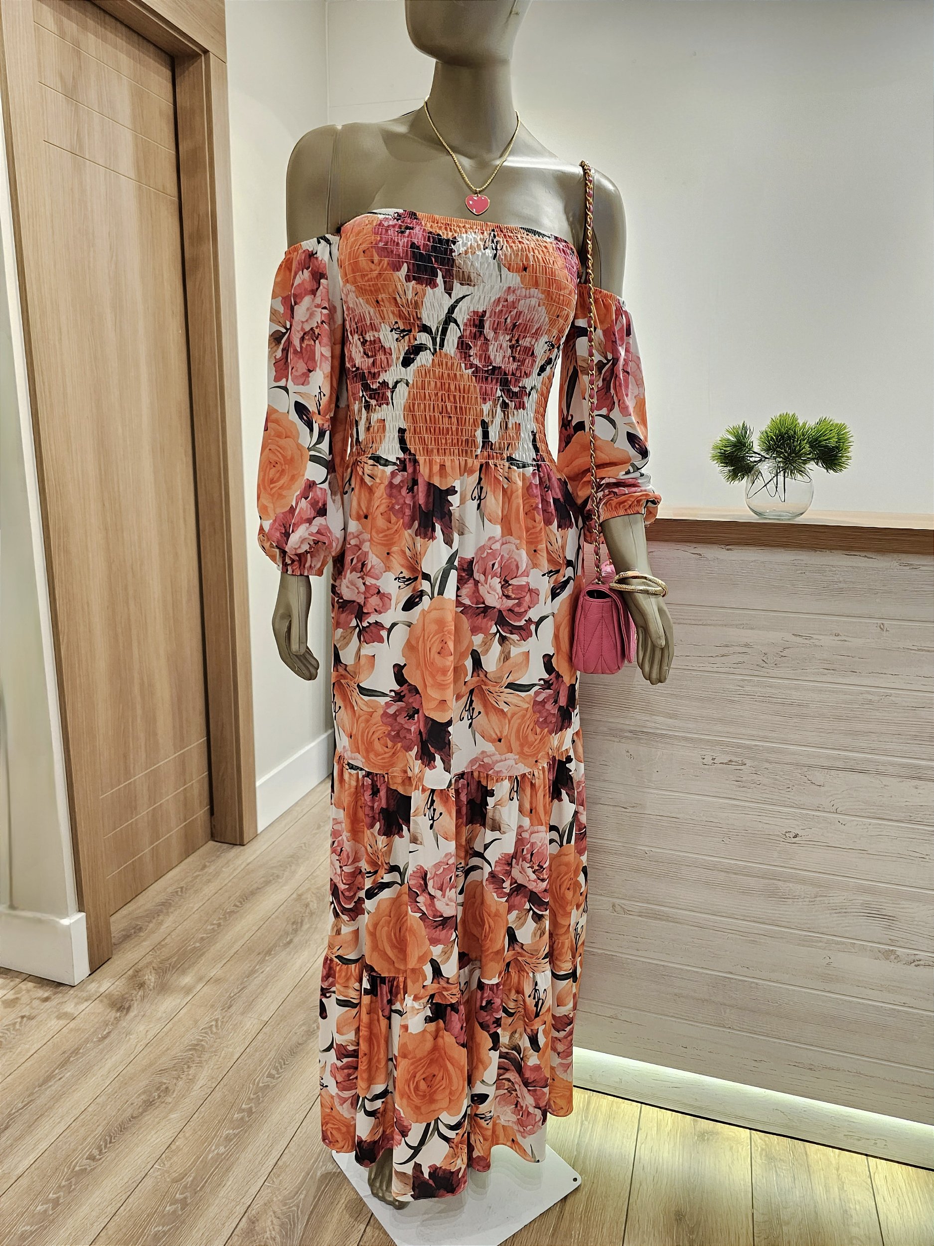Vestido floral alegre, padronagem que exala feminilidade. Tonalidade fundo off-white e tons cor de rosa e laranja.
