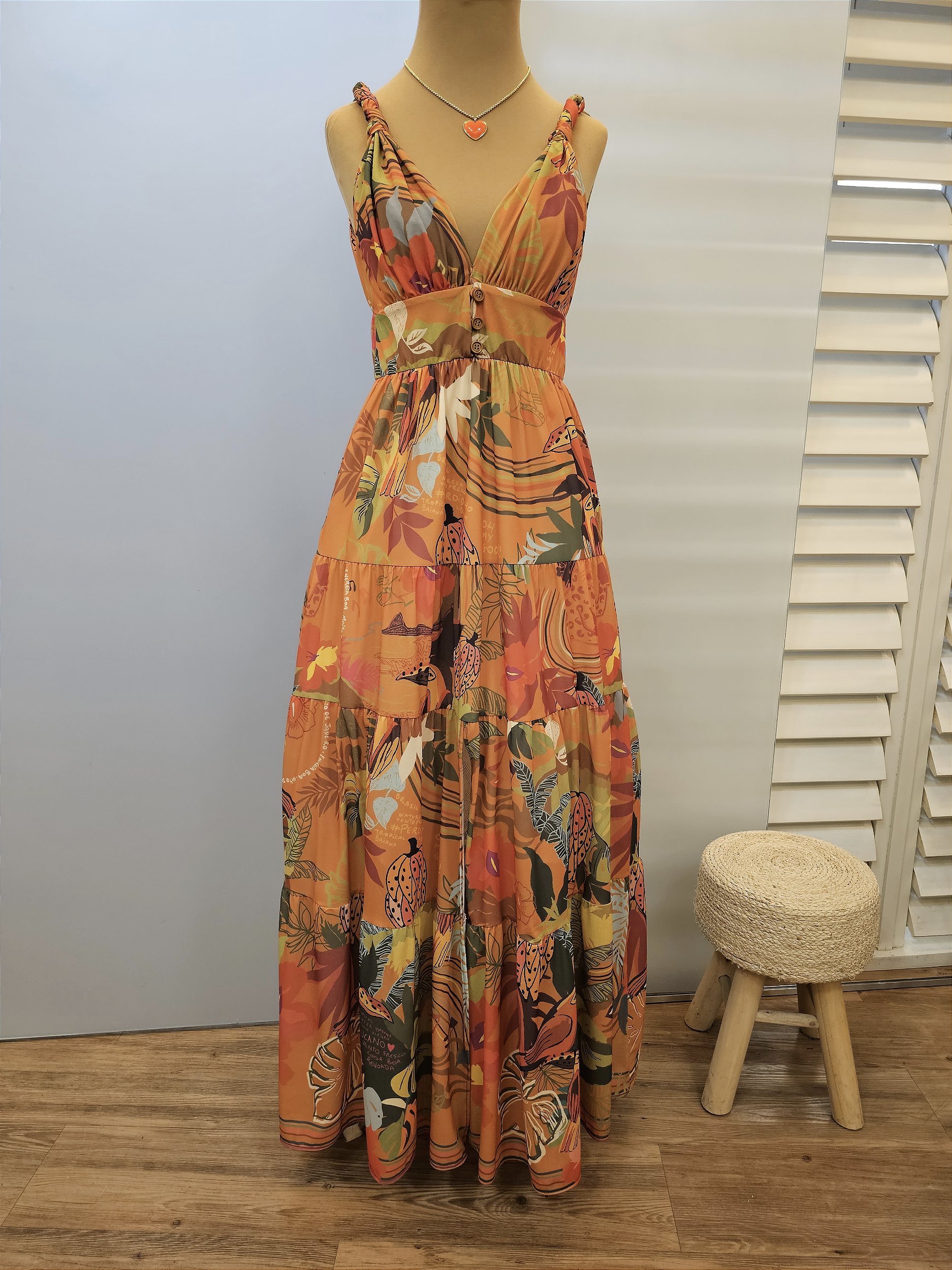 Vestido longo Revoada laranja, tem estampa inspirada na fauna e flora brasileira, alças em amarração que pode ser laços, dando um toque romântico e delicado a peça.